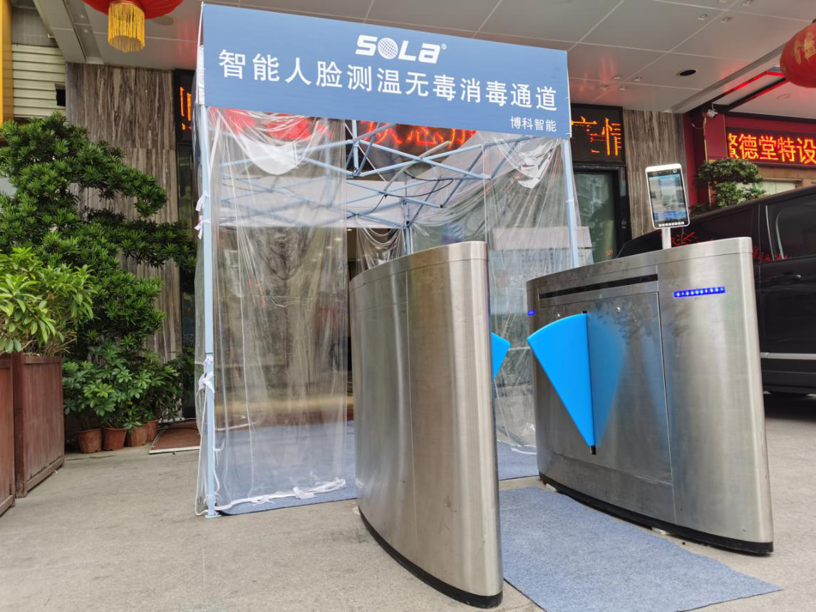 博科&索拉自主研發出抗擊疫情智能設備——智能人臉測溫無毒消毒通道,已申請專利。本產品按門禁使用,若體溫正常便自動打開門禁閘機放行,感應系統感...